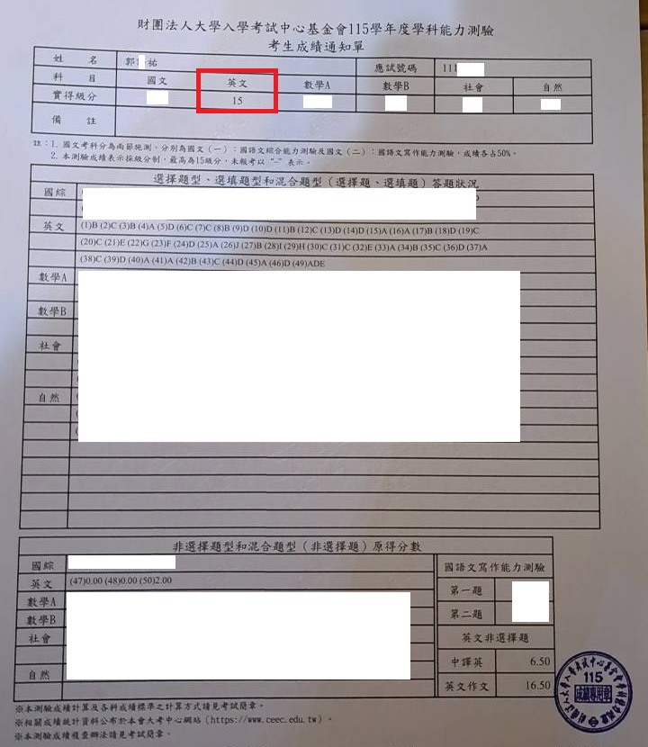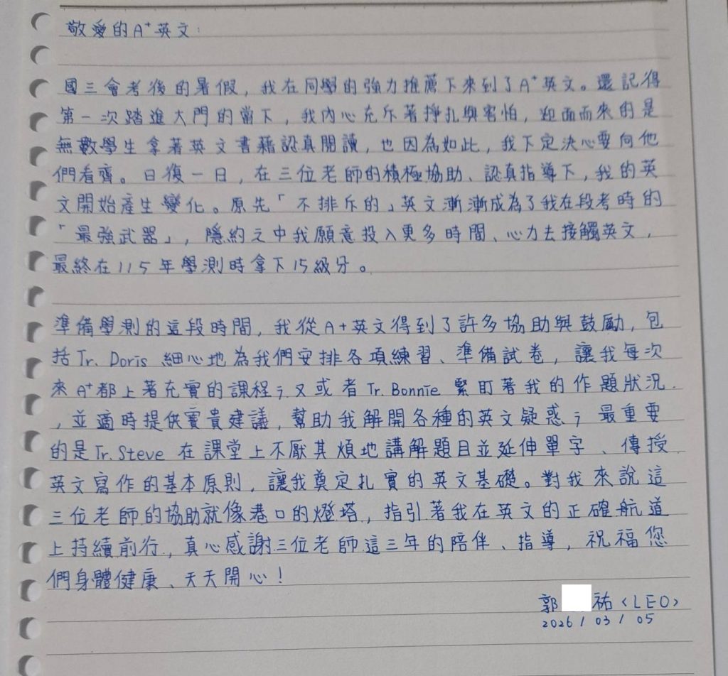 Leo同學在此次的大學學測中英文科得到15滿級分的優異成績。透過老師有規劃的引導方式,藉由有規律的上課,Leo同學便在老師循序漸進的引導下取得滿分的成績,更凸顯出有規律參加Aplus美語課程的重要性。在國中和高中英文科難度相差極大的情形下,大部分的學生進入高中之後在英文這一科都遭受到不小的打擊,考量到希望能協助學生在學測前有效地利用時間學習並增加自己的能力,Aplus美語的高中課程設計即是藉由學生有規律的參與課程,並於上課中吸收老師所重點整理的重要觀念,進而達到穩定進步的目標。詳細課程內容請洽04-2326-7868!