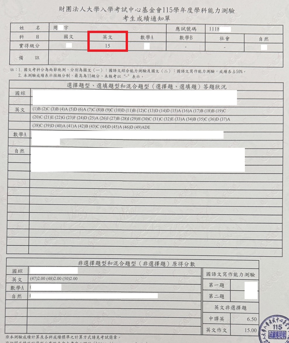 Charles同學在此次的大學學測中英文科得到15滿級分的優異成績。透過老師有規劃的引導方式,藉由有規律的上課,Charles同學便在老師循序漸進的引導下取得滿分的成績,更凸顯出有規律參加Aplus美語課程的重要性。在國中和高中英文科難度相差極大的情形下,大部分的學生進入高中之後在英文這一科都遭受到不小的打擊,考量到希望能協助學生在學測前有效地利用時間學習並增加自己的能力,Aplus美語的高中課程設計即是藉由學生有規律的參與課程,並於上課中吸收老師所重點整理的重要觀念,進而達到穩定進步的目標。詳細課程內容請洽04-2326-7868!